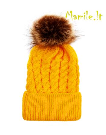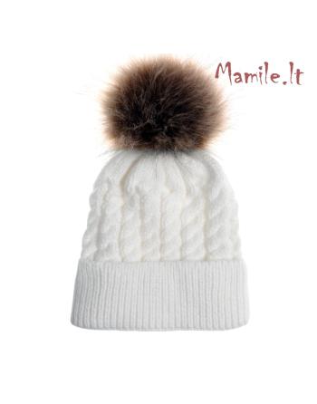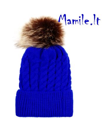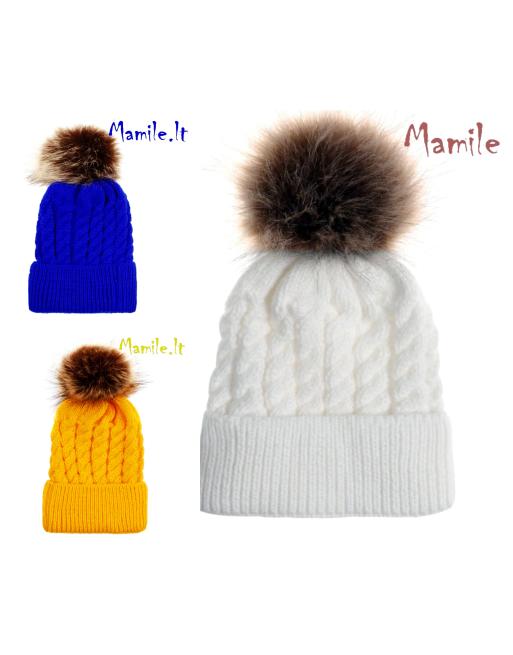 Ryškios, šiltos kepurės su kailiniais bumbulais.
