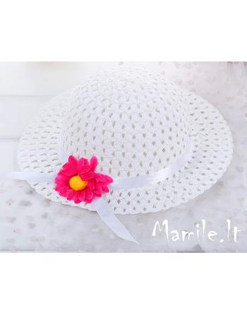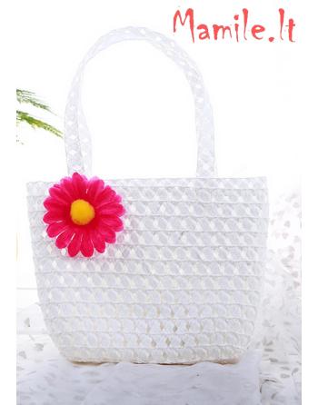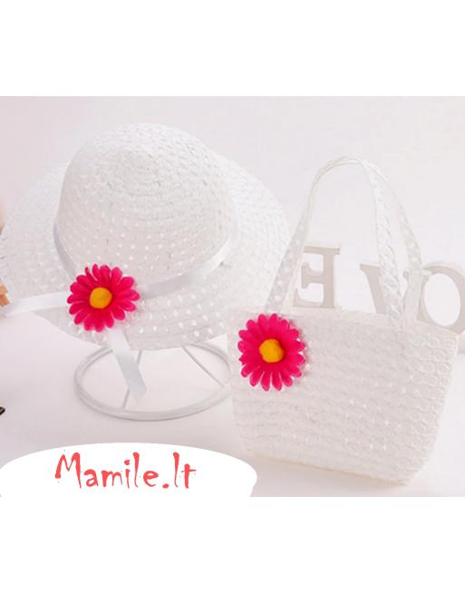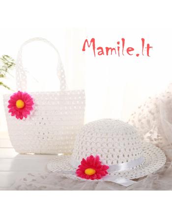 Komplektuką sudaro: Šiaudinė skrybėlaitė ir rankinė puoštos ryškiomis gėlėmis.