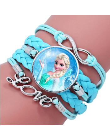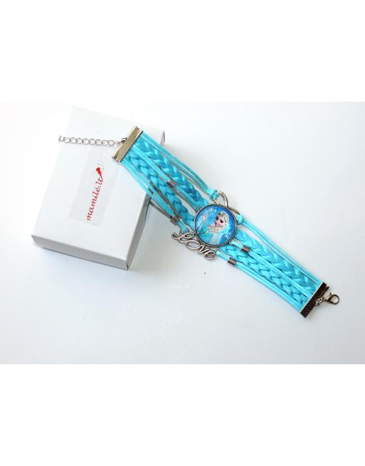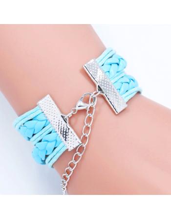 Pagaminta iš dirbtinės odos pynučių, medžiaginių juostelių, sidabro spalvos bižuterinio metalo ir žavaus pakabuko stikle.