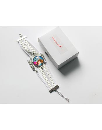 Pagaminta iš dirbtinės odos pynučių, medžiaginių juostelių, sidabro spalvos bižuterinio metalo ir žavaus pakabuko stikle.