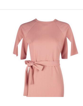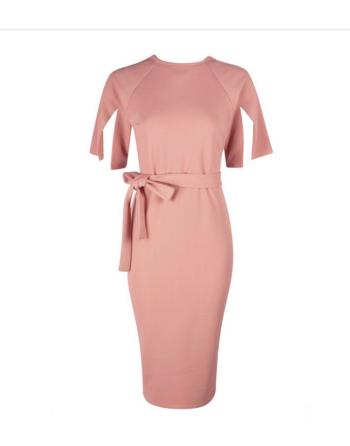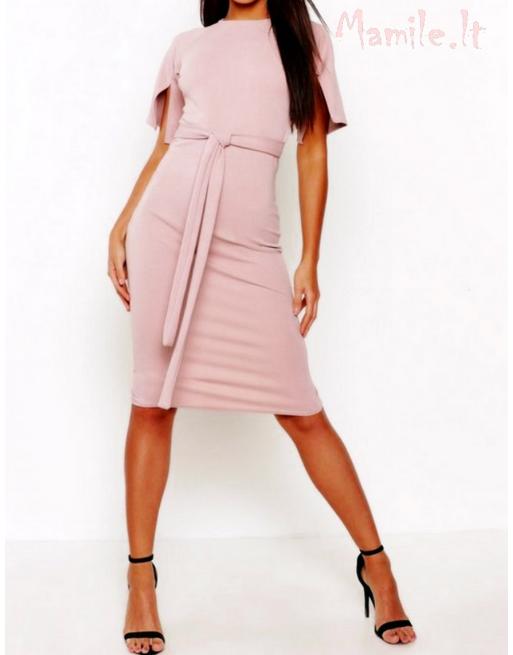 Suknelę puošia stilingos – skeltos rankovės ir ilgas, surišamas dirželis.