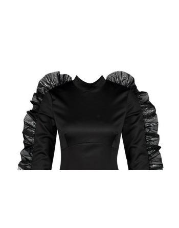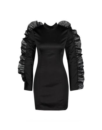 Juoda, blizgaus audinio suknelė su žavingais raukiniais ant rankovių - puikus pasirinkimas šventei, kokteilių vakarėliui ir ne tik.